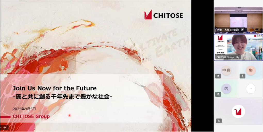 9月5日(金)、NITE(独立行政法人 製品評価技術基盤機構)が主催する「NITE講座『未来は藻が拓く』~食料、エネルギー、環境を変える藻類の力~」がオンラインで開催され、Tech & Biz Development Div. Managerの猪崎風葉が登壇しました。本講座は毎年事業者向けに実施されているもので、今年度は大阪・関西万博に合わせて「藻類」をテーマに企画され、オンラインで490名が参加しました。
