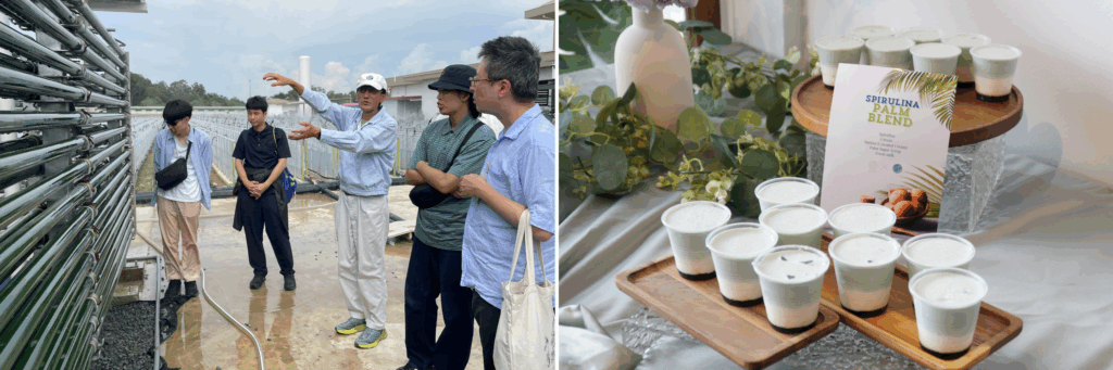 CAFではまず始めに、食用の生スピルリナ「タベルモ」の生産とその工程について説明をしました。続いて、GPC※5での現行の培養工程を解説し、実際の培養の様子を見学しました。食用であることから、培養中に他の藻類種が混入しないかといったコンタミネーションに関する質問や、GPCのメンテナンス体制について多くの関心が寄せられました。 その後、ブルネイにあるヴィーガンカフェで提供されているCAFで生産・加工された「タベルモ」を使用した4種類のドリンクを試飲。受講者からは「全然嫌な匂いがしなくて美味しい」「普通におしゃれなドリンク」といった感想が聞かれ、これまで見学してきた微細藻類が実際に美味しく活用され、ただ単に代替品でなく、食として目で見て楽しむというフェーズにまで来ていることを体感する貴重な機会となりました。