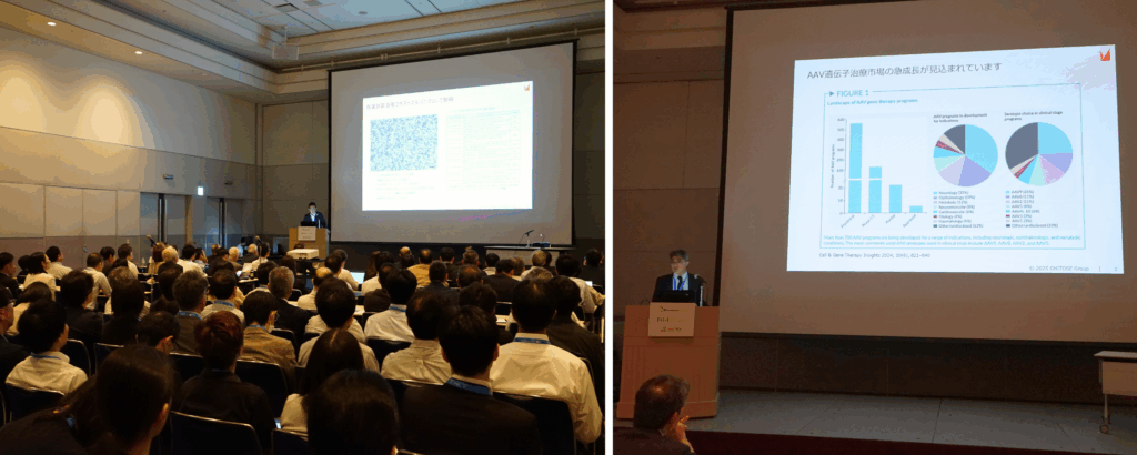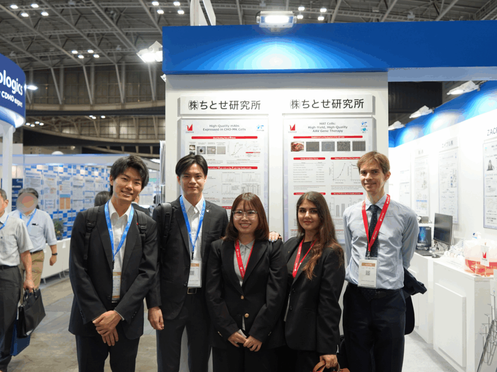 細胞領域では、ちとせが樹立したCHO-MK細胞とHAT細胞※2についてご紹介しました。CHO-MK細胞は、他のCHO細胞と比較して著しく高い生産性を有するバイオ医薬品製造用宿主細胞であり、HAT細胞は、アデノ随伴ウイルス(AAV)を用いた遺伝子治療薬の製造に特化した高性能な細胞株です。国外への進出にも注力する同領域では、日本、インドネシア、フランス、タイ、イラン出身のメンバーらがブースに立ち、両細胞の樹立過程や次世代バイオ医薬品製造におけるボトルネックを解消する高い可能性についてご紹介いたしました。