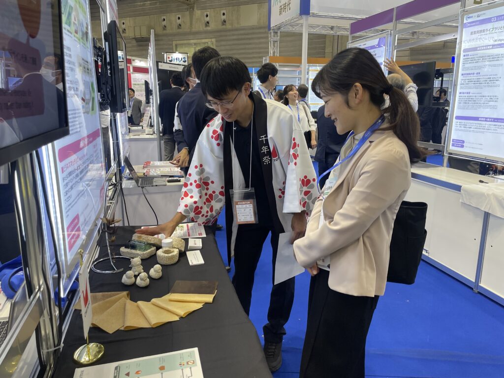 こちらのブースでは、地域から排出される有機廃水、食品・農業・木質廃棄物などといった未利用有機廃棄物を資源化するシステムを紹介しました。これは、複数の生物変換技術を組み合わせることで、廃棄物を無駄なく資源化していく取り組みです。ちとせでは、この資源循環システムを基盤とした地域「ちとせバイオエボリューションディストリクト」の実現を目指し、農業や街づくりを絡めた包括的な事業を推進していることをご説明いたしました。また、今回は特別に、資源循環システムから生まれる高付加価値製品の一つとして、開発を進めているキノコレザーの実物もご紹介し、来場者の注目を集めました。