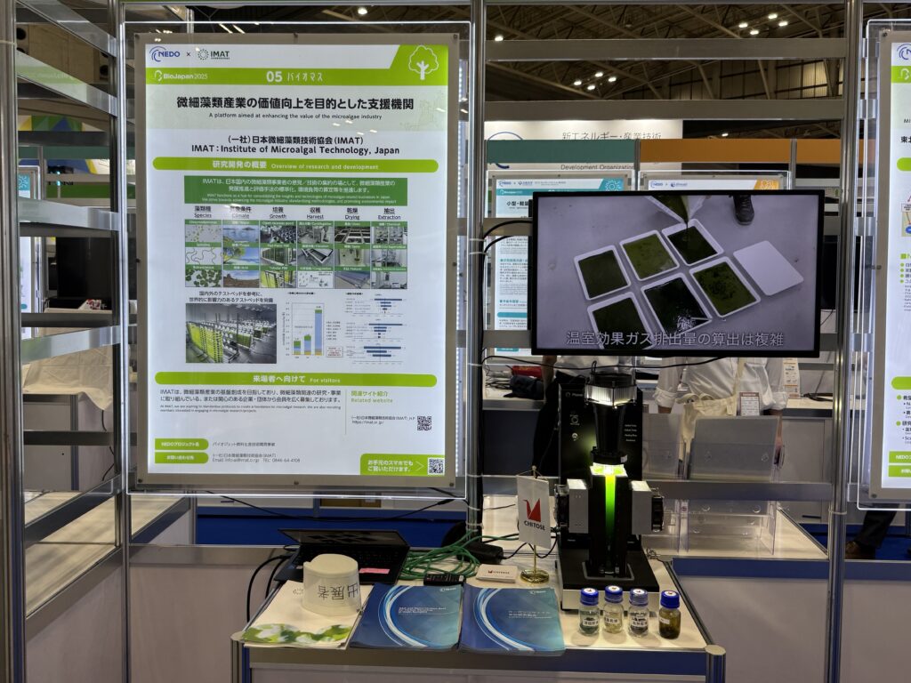 IMAT(一般社団法人日本微細藻類技術協会)は、藻類の産業利用や関連技術の発展を推進する目的で設立された広島県に拠点を置く社団法人です。藻類に関する研究基盤の構築に取り組んでおり、ちとせ研究所からの出向社員である野村純平がIMAT事務局長を、青木慎一が研究開発部長を務めております。BioJapanの開催中は、広島県から青木が訪れ、藻類培養技術や協会の取り組みについてご説明いたしました。