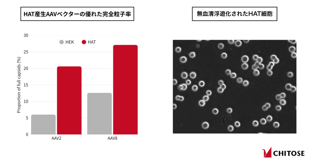 HAT細胞で産生されたAAVベクターは、HEK293細胞と比較して高い完全粒子の割合を示した(AAV2:20.6%対6.0%、AAV8:27.1%対12.6%)。