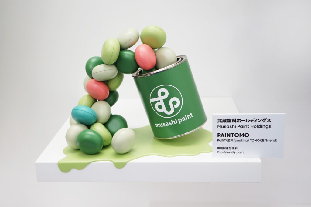 藻類由来の原料からつくられた環境配慮型塗料を使用し、持続可能な未来を象徴するオブジェを制作しました。塗料缶から革新的な塗料が飛び出す様子を造形することで、自然由来の創造力が広がり、未来へとつながる前向きなエネルギーを表現しています。