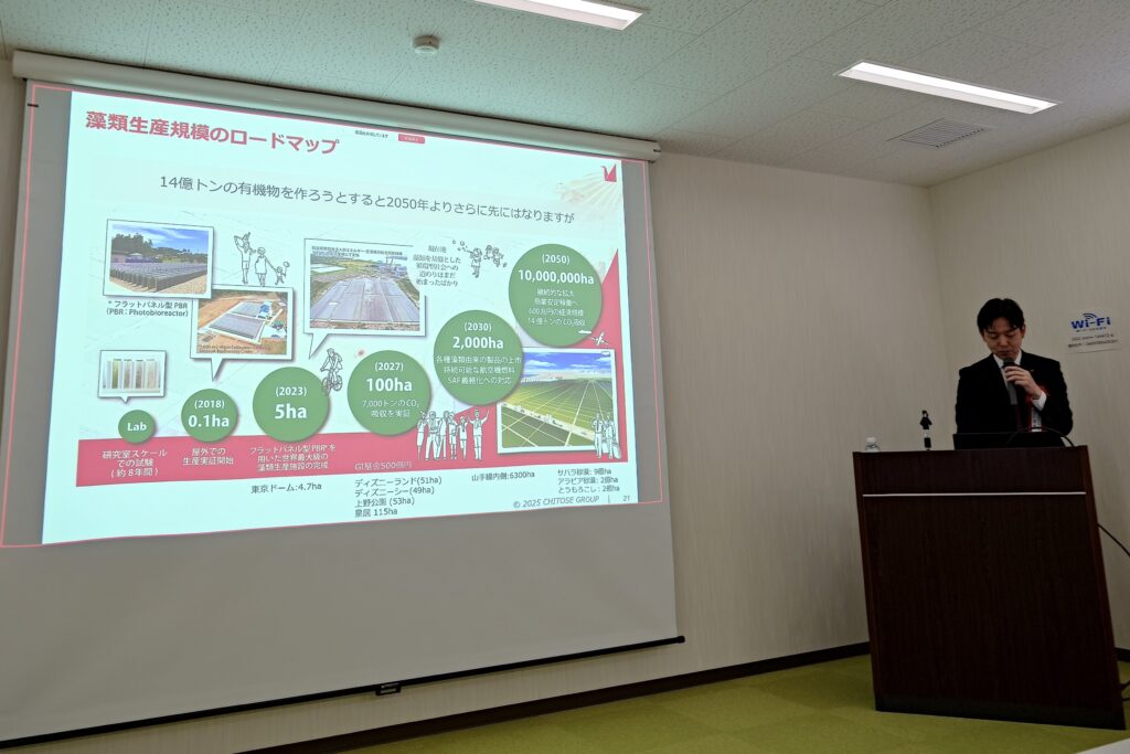 その後、微細藻類産業の未来をテーマとした勉強会が行われ、笠原は「ちとせグループが展開する光合成基点の産業バイオ化」と題して登壇しました。講演では、循環型のバイオエコノミーの実現における微細藻類の重要性や、ちとせグループが構想する微細藻類による産業のバイオ化について説明しました。参加者の皆さまが設備を前に議論を交わす姿や、熱心に聴講される様子から、微細藻類産業への期待と関心の高まりを改めて実感いたしました。ちとせグループは、微細藻類基点の産業構築に向けて活動を一層強化してまいります。