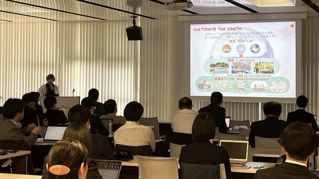 フラッシュトーク後のポスター発表では、生物工学に関心を持つ参加者に対して、藻類を活用した用途開発や技術開発、そして藻類を基点とした社会構築に向けたちとせの挑戦についてお伝えしました。参加者との交流の中で、バイオエコノミーの実現に向けたちとせへの期待を実感するとともに、次世代を担う学生の皆さまと意見を交わす貴重な機会となりました。