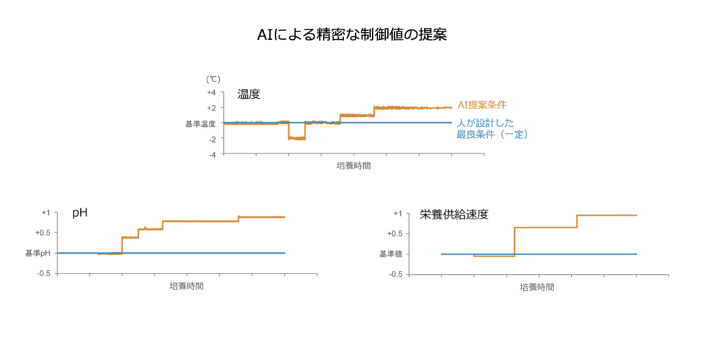 制御対象となったのは、発酵プロセスで一般的に使用される、温度、pH、栄養供給速度の3つの項目です。特別な制御項目や装置を用いたわけではなく、既存の制御対象を、培養状態の変化に応じて動的に調整するという精密な制御を行うことによって、この成果が得られました。