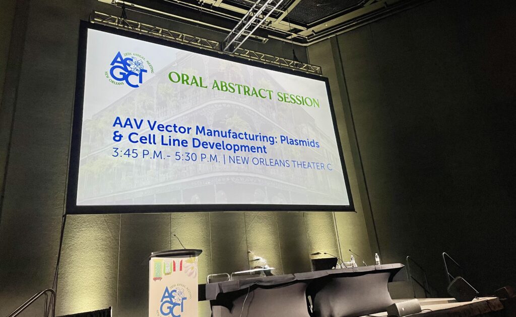 Senior Bioengineer Yu-Hsin Chang delivered an oral presentation showcasing CHITOSE’s pioneering work on the establishment and development of Human Amniotic epithelial cell line for gene and cell Therapy (HAT)*1. The presentation, titled “Establishment of a Novel Human Cell Line, HAT, for High-Yield and High-Quality AAV Manufacturing,” was presented on May 16 during the “AAV Vector Manufacturing: Plasmids & Cell Line Development” session, drawing an audience of 200–300 participants.